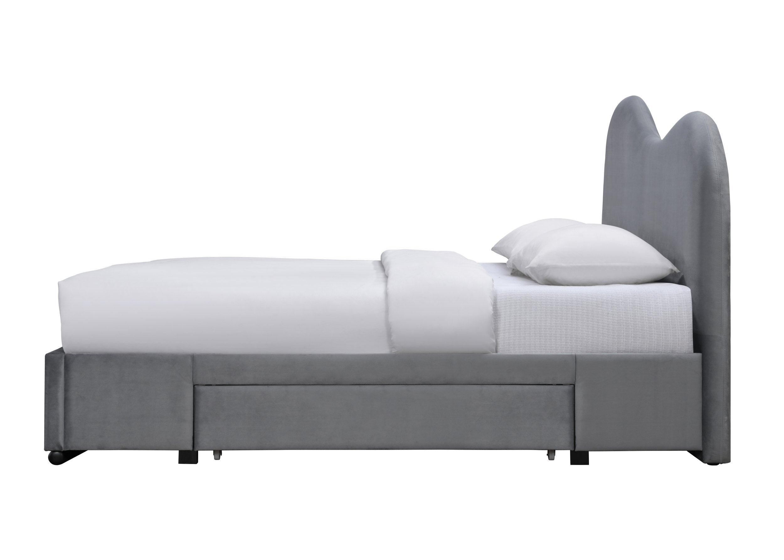 A Daker ágykeret stílusos és praktikus választás modern otthonokba. A finoman ívelt fejtámla játékos, mégis elegáns megjelenést kölcsönöz az ágynak, míg a beépített, görgős fiókok extra tárolóhelyet biztosítanak az ágyneműk vagy szezonális kiegészítők számára. Tökéletes választás azoknak, akik a design és funkcionalitás kombinációját keresik.