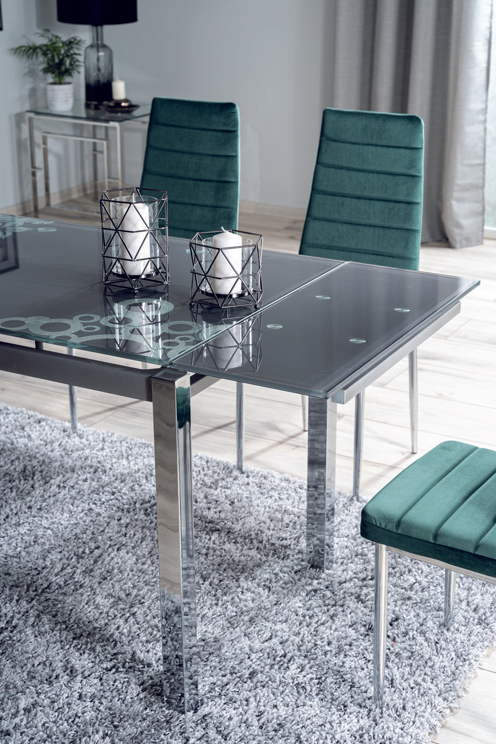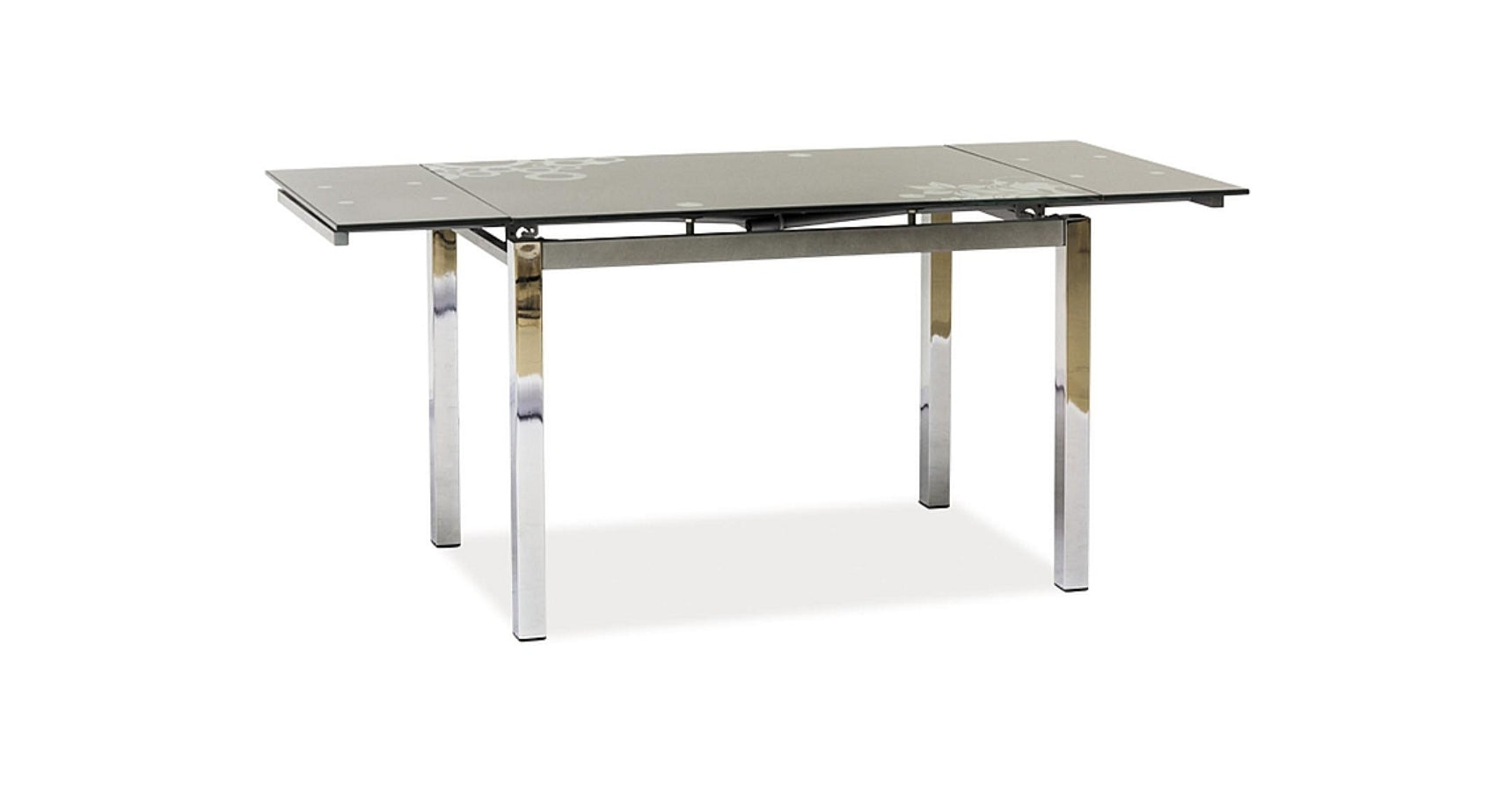 Mintás, színes üveg asztallap és króm asztallábak, kell ennél több? Az Edith üveg étkezőasztal bővíthető asztalvéggel, könnyen tisztítható felülettel ideális választás lehet mindenki számára. Vess csak egy pillantást a képekre! Mintás asztallapja és szögletes lábai különböztetik meg az Edith termékcsalád többi tagjától.