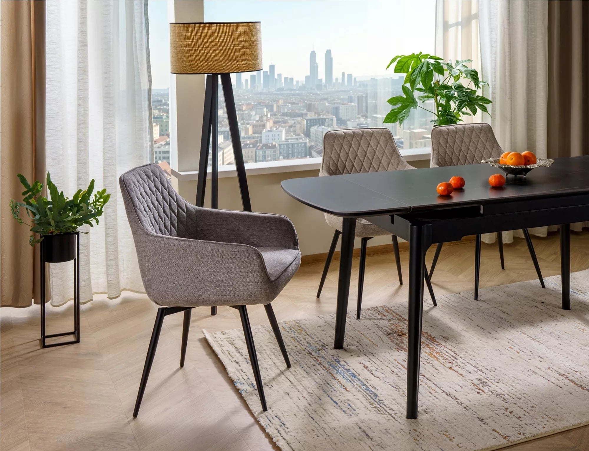A Hagan étkezőszék elegáns megjelenésével és modern formavilágával stílusos kiegészítője lehet bármilyen enteriőrnek. A sűrű szövésű kárpit puha tapintású felületével luxusérzetet kölcsönöz, míg a háttámlán található gyémánt mintás steppelés karaktert ad a széknek. A vékony, fekete fém lábak stabil alapot biztosítanak, így nemcsak esztétikus, de rendkívül tartós is.